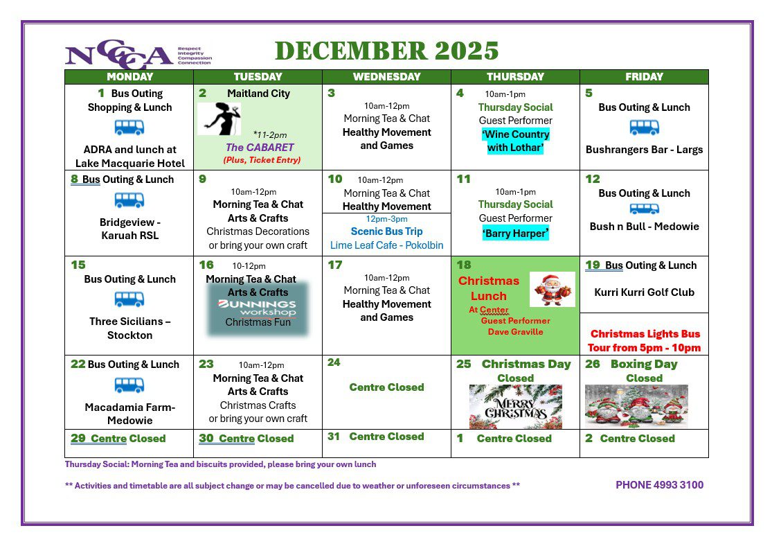 Check out our popular social calendar. Spaces fill fast and some activities may have limited spaces to ensure maximum support by our dedicated Coordinator.