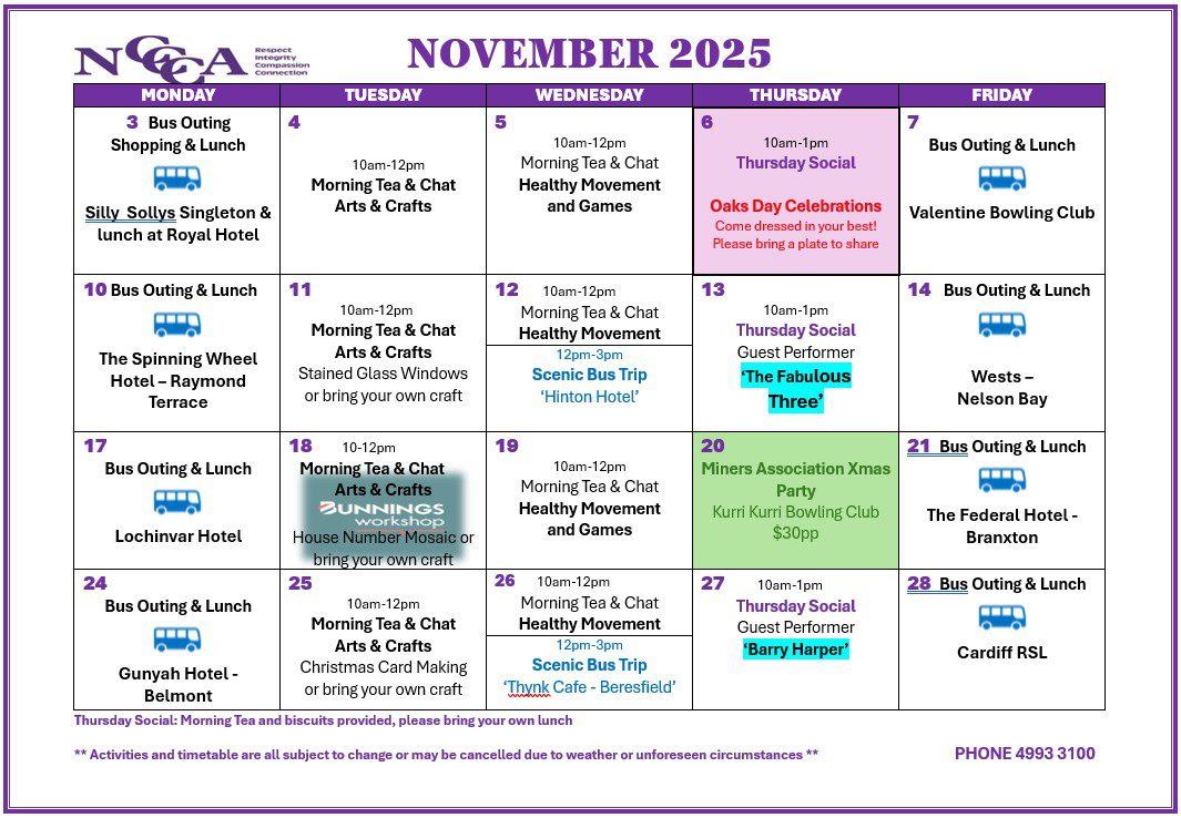 Check out our popular social calendar. Spaces fill fast and some activities may have limited spaces to ensure maximum support by our dedicated Coordinator.