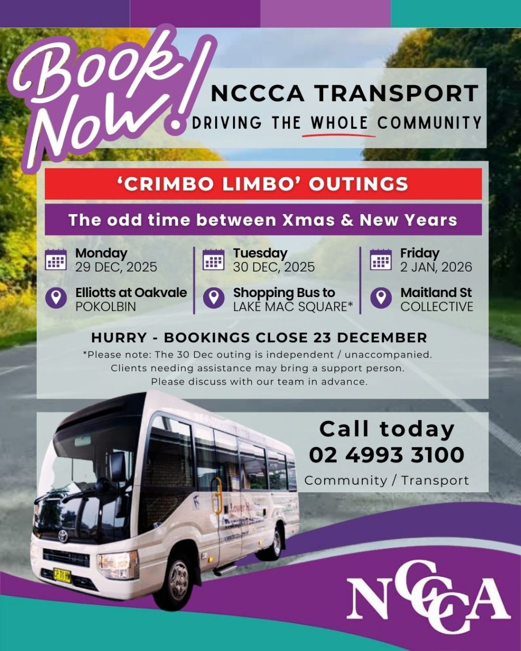 Call NCCCA Transport to secure your bookings or more info on 02 4993 3100